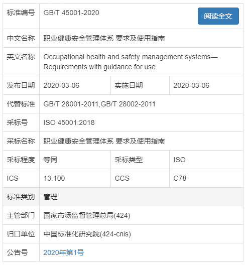 據國家標準委官網消息,GB/T 45001-2020《職業健康安全管理體系—要求及使用指南》正式發布,于2020年3月6日實施。