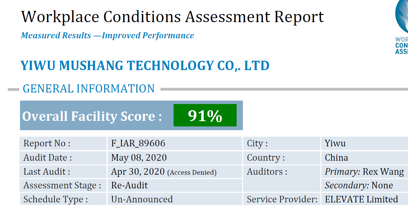 祝義烏市木上電子科技有限公司在創思維驗廠網輔導下順利通過ELEVATE審核的WCA驗廠并取得91分