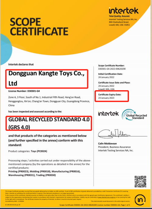 2022年初在創思維驗廠之家輔導下順利通過全球回收標準GRS認證。
