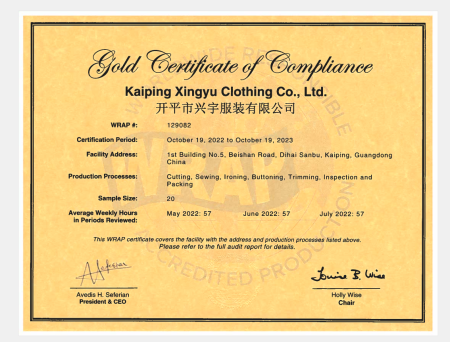 祝賀開平市興宇服裝有限公司2022年快速通過WRAP認證