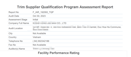 在創思維驗廠網老師專業技術、全程跟進耐心細致輔導以及公司全體員工配合下,一次性順利通過ITS-TQP驗廠審核并且獲得94分,為將來公司發展奠定了良好的發展基礎,既開拓了市場同時也增加了消費者對公司的信賴,在這里再次祝賀HONGKONG俊文(越南)有限公司2023年一次性成功通過ITS-TQP驗廠審核并且獲得94分,同時也期待未來再次與創思維驗廠網合作!