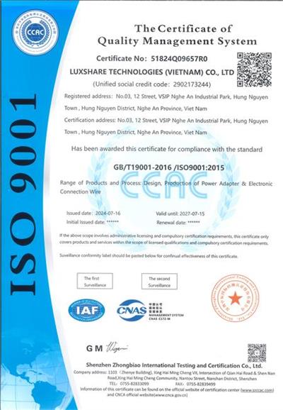 祝賀立訊技術(shù)(越南)有限公司 LUXSHARE TECHNOLOGIES (VIETNAM) CO., LTD 2024年快速通過(guò)ISO9001認(rèn)證