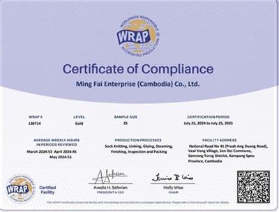 祝賀Ming Fai Enterprise (Cambodia) Co., Ltd.柬埔寨工廠2024年快速通過WRAP認(rèn)證