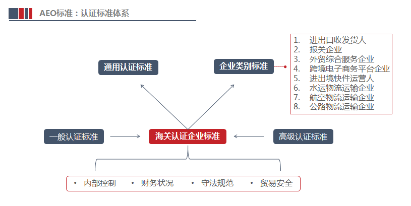 截至目前,《海關認證企業(yè)標準》體系為“1+8”模式,即,通用標準加進出口收發(fā)貨人、報關企業(yè)、外貿綜合服務企業(yè)、跨境電子商務平臺企業(yè)、進出境快件運營人、水運物流運輸企業(yè)、航空物流運輸企業(yè)、公路物流運輸企業(yè)8個單項標準。